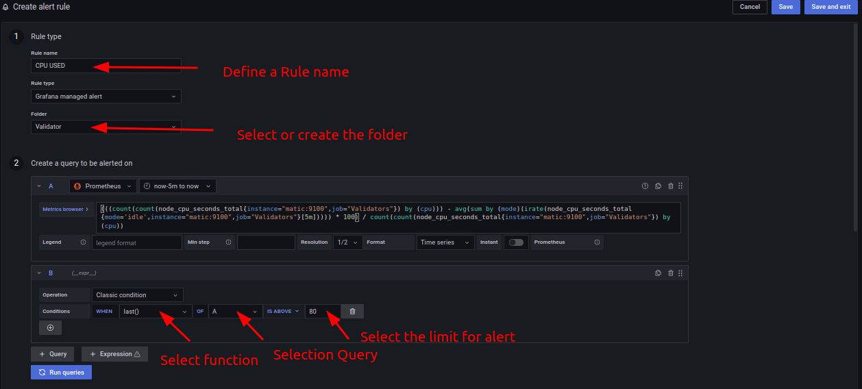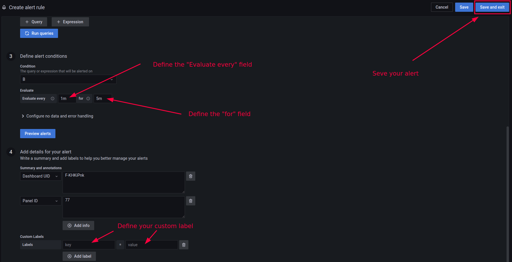 #### 7 - Set the field "evaluate every" and "for", if necessary add a custom label and then click "Save and exit"