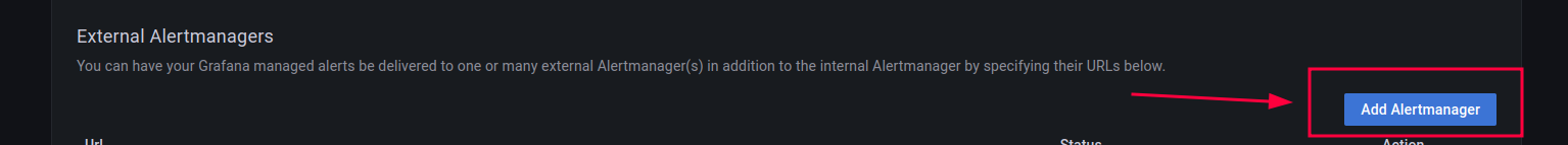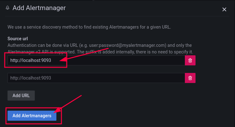 #### 3 - Set the URL where your external alertmanager instance is installed and click on the "Add alertmanagers" button
