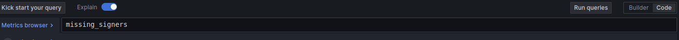 With the panel created, the next step is to define the query to display the `missing_signers` metric.